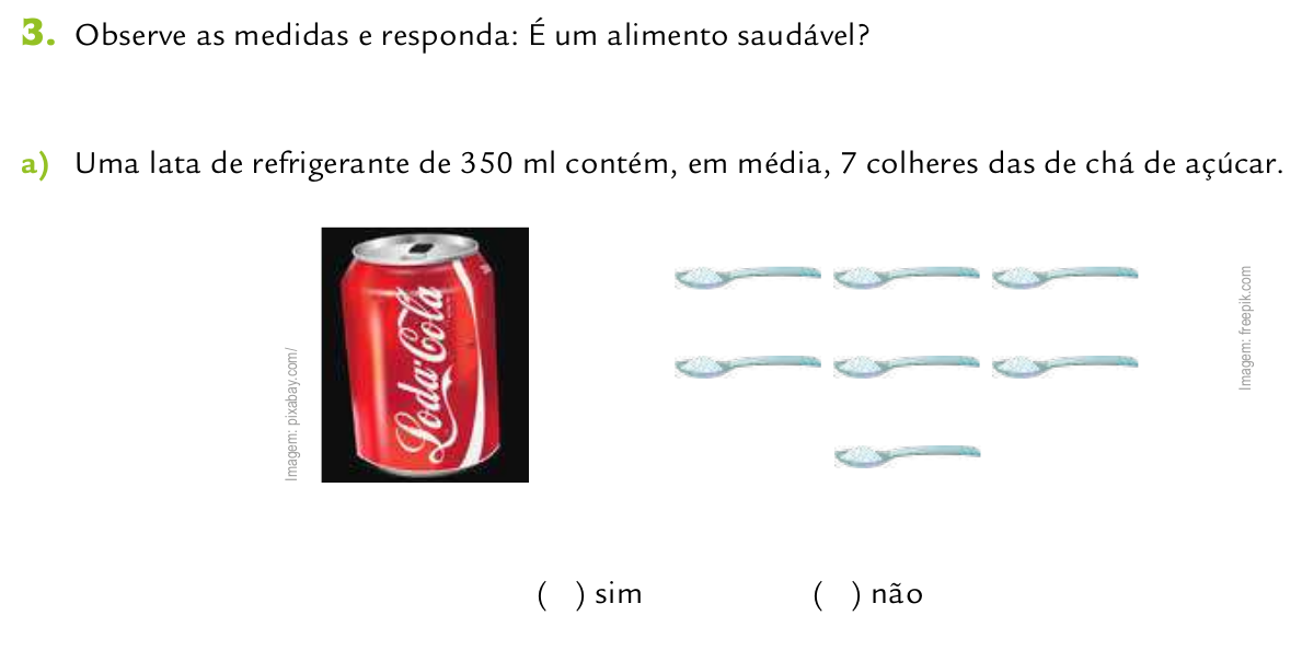 Conforme a imagem ao lado, uma colher de sopa é o dobro do tamanho da colher de chá. Já a colher de sobremesa possui tamanho intermediário. Analise novamente as ilustrações do exercício e veja que a mesma representação de colher foi utilizada para os diferentes tamanhos. Elaborado para ser guiado por critérios subjetivos, o exercício pode induzir o aluno a inferir que uma lata de refrigerante possui mais que o dobro de açúcar das três biscoitos recheados. Sendo que, a partir dos dados apresentados, as quantidades de açúcar nessas duas quantidades de alimentos são muito próximas.