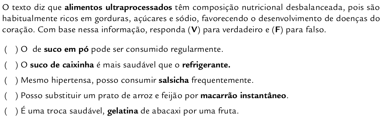 Atente-se ao fato de que o termo “alimentos ultraprocessados” estar em negrito no enunciado, assim como, outros termos nas assertivas que seguem. Tal formatação induz o aluno a correlacionar os termos em negrito como alimento ultraprocessado. Assim sendo, de que forma o aluno deve responder a assertiva “O suco de caixinha é mais saudável que o refrigerante”, já que o enunciado indica que tanto o suco de caixinha quanto o refrigerante sejam alimentos ultraprocessados?