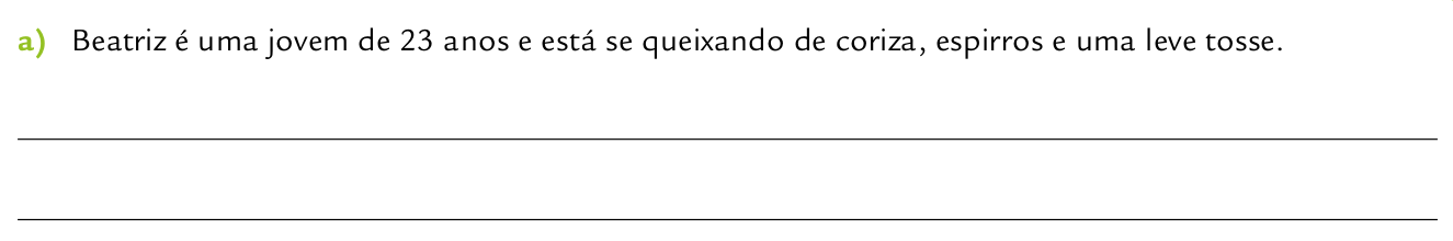 Observe que a única pessoa que possui sintomas de coronavírus é a senhora de 75 anos, chamada Amanda (item b). Por qual motivo foi adicionado a idade das personagens em um exercício que visa identificar a doença a partir de seus sintomas? Seria a idade um sintoma da Covid-19?